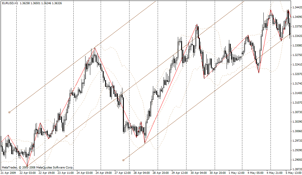 Практически, «вилы Эндрюса» строятся автоматически после нашего выбора 3-х указанных точек. Использование «вил Эндрюса» аналогично работе с линиями сопротивления и поддержки, т.е. когда цена находится у нижней линии «вил» — открываем позиции на покупку и удерживаем их, пока не достигнем средней линии. В этой точке либо закрываем позицию, либо фиксируем часть прибыли. И, наоборот, когда цена находится у верхней линии «вил» открываем позиции на продажу до пересечения со средней линией.