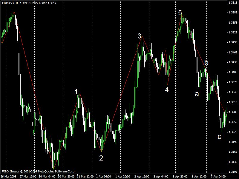 Модель направленного движения цен на рынке Форекс согласно «закону волн» Р. Эллиота. Развитие рыночных цен, в конечном счете, всегда принимает фигуру пяти волн особой структуры. Три из них, помеченные цифрами 1, 3 и 5, действительно совершают направленное движение. Это импульсные волны, всегда создающие новый максимум или минимум. Они разделяются двумя откатами – волнами противоположного направления, которые помечаем цифрами 2 и 4. Это коррекционные волны, никогда не создают новых максимумов или минимумов. Эти два отката являются неотъемлемой частью общего направленного движения. Пятиволновая модель движения цен на рынке – базисная фигура. Цена на рынке всегда может быть определена как находящаяся где-то на базовой пятиволновой модели.